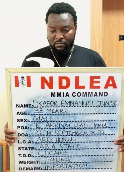 Operatives of the National Drug Law Enforcement Agency (NDLEA) have arrested an ex-footballer, Okafor Emmanuel Junior at the Murtala Muhammed International Airport, Ikeja, Lagos, on his arrival from Sao Paulo, Brazil via Addis Ababa, Ethiopia on board an Ethiopian airlines flight with 1.40kg crack cocaine concealed in his bags.