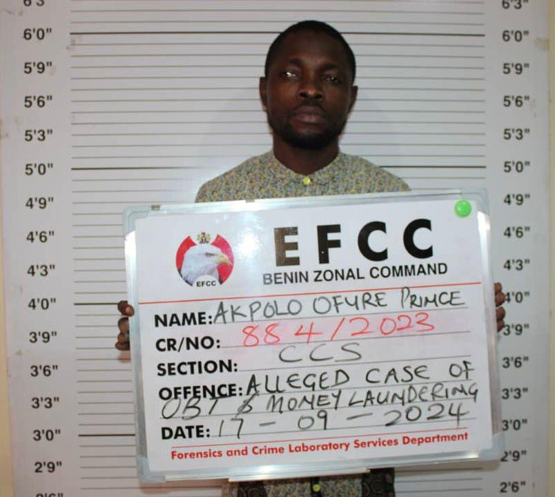The charge against Akpolo reads: That you Ofure Prince Akpolo (m) on or about the the 3rd day of June. 2024 in Benin City, Edo State within the jurisdiction of this Honourable Court did without lawful authority take possession of the sum of $22, 297.97 (Twenty-Two Thousand, Two Hundred and Ninety-Seven United States of America Dollars, Seven cent) in your domiciliary account number: 5436344024 domiciled in First City Monument Bank knowing that the money represent proceeds of your criminal conduct to wit: Cybercrime and thereby committed an offence contrary to Section 18 (1) (a) of the Economic and Financial Crimes Commission (Establishment) Act 2004 and punishable under section 18 (2) of the same Act..