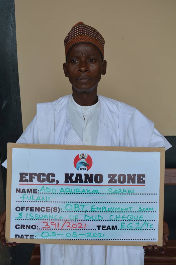 The charge against the convict reads in part, “That you Ado Abubakar Fulani sometimes in January, 2021 at Kano with intent to defraud did obtain the sum of N330,000.00 from Muhammad Balanti Adam, which money you caused to be paid into your First City Monument Bank account number 6491929010 under the false pretence that you will secure an offer of appointment for him with the Nigeria Customs Service contrary to section 1 (1)(a) of the Advance Fee Fraud and Other Fraud Related Offences Act, 2006 and punishable under section 1 (3) of the same Act.”