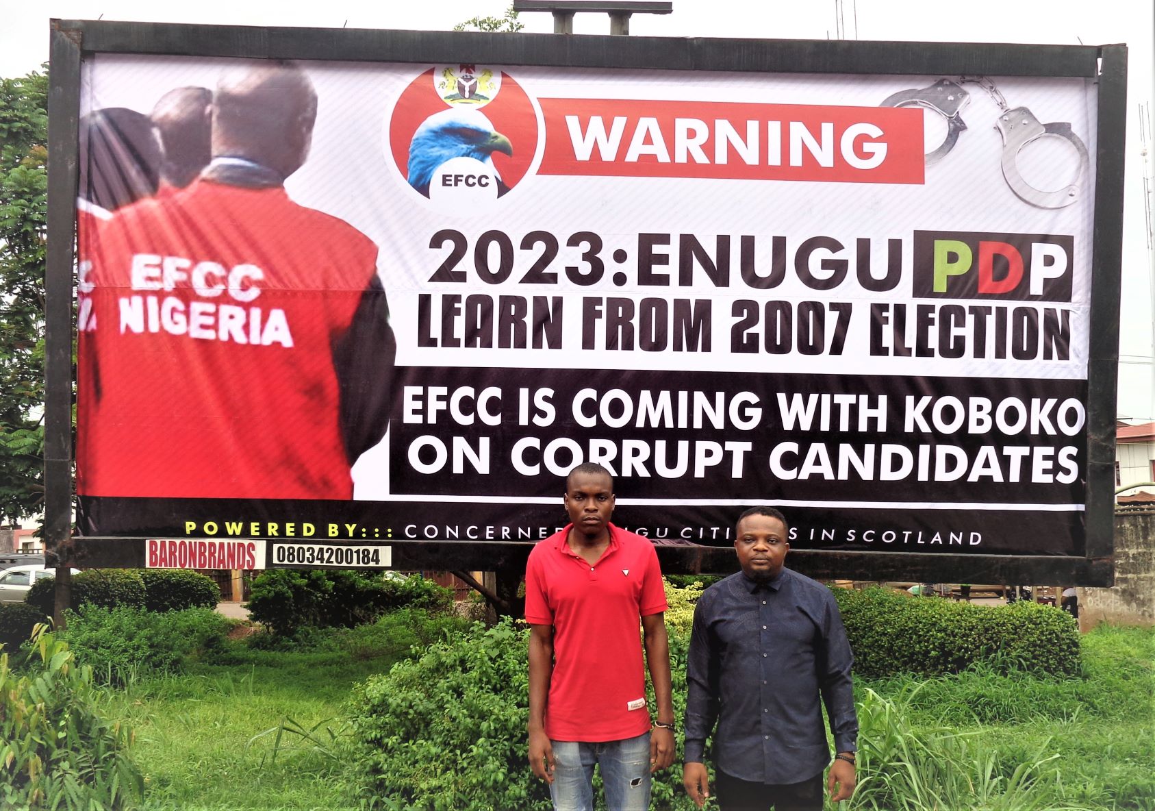 The two Super 48 Sheet Billboards located at Otigba and Zik Avenue Junctions in Enugu, bore offensive messages using the name of the EFCC to threaten the aspiration of some politicians in the state in the build up to the 2023 general elections. One of the messages reads: 2023: Enugu PDP Learn From 2007 Election… EFCC IS COMING WITH KOBOKO ON CORRUPT CANDIDATES.