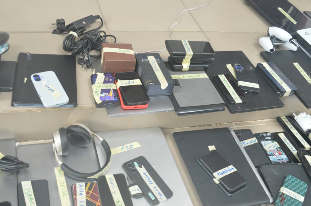 Items recovered from them include: nine Samsung mobile phones, 15 iPhones, one infinix phone, three Redmi phones, two iPads, one Peugeot 406 car, two Playstation 4, one PlayStation 5, four Neonx Auto bike, eight laptop computers, one Maxi E50KWH generator and one pistol.