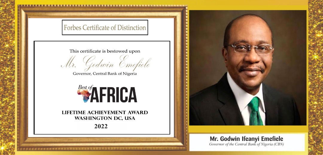 Forbes New York has honoured the Governor of Central Bank of Nigeria (CBN), Mr Godwin Emefiele, with the Forbes Best of Africa Lifetime Achievement Award.