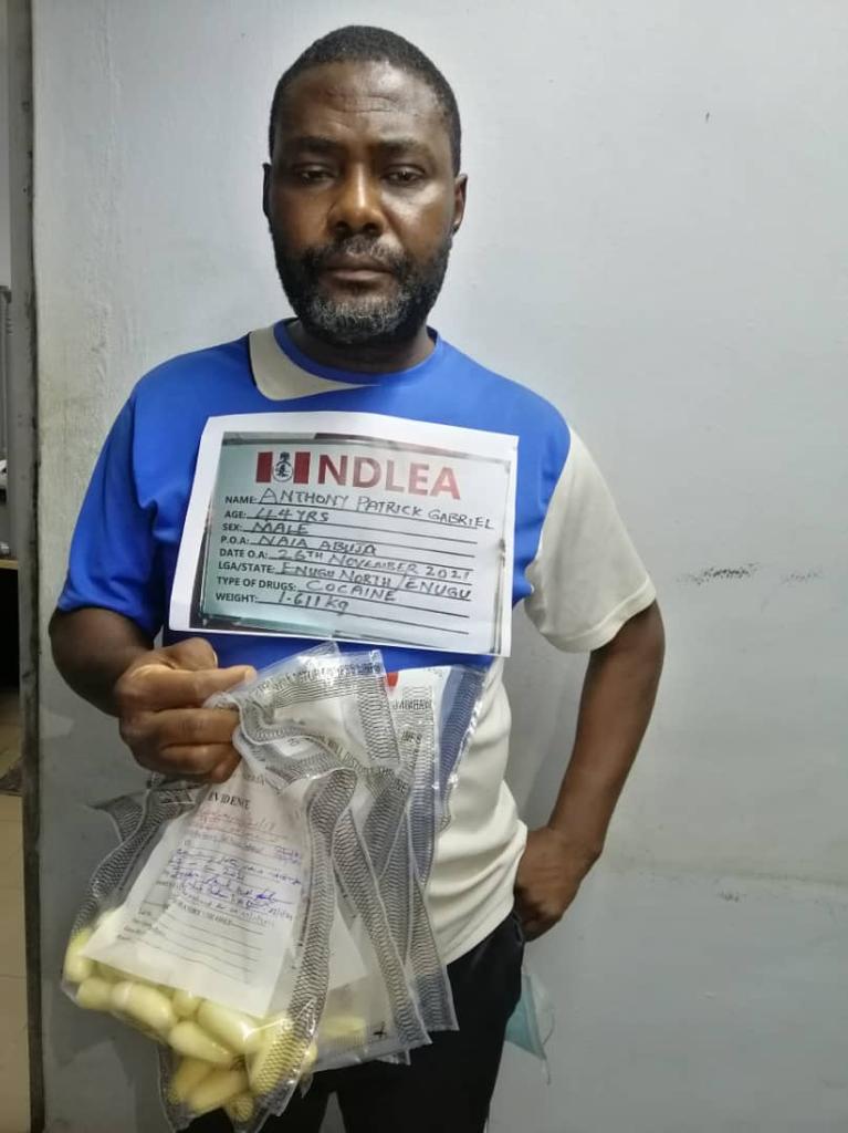 A 44-year-old father of three, Gabriel Anthony Patrick has been arrested by operatives of the National Drug Law Enforcement Agency, NDLEA, at the Nnamdi Azikiwe International Airport, NAIA, Abuja for ingesting 96 pellets of cocaine, which he excreted in the custody of the Agency.