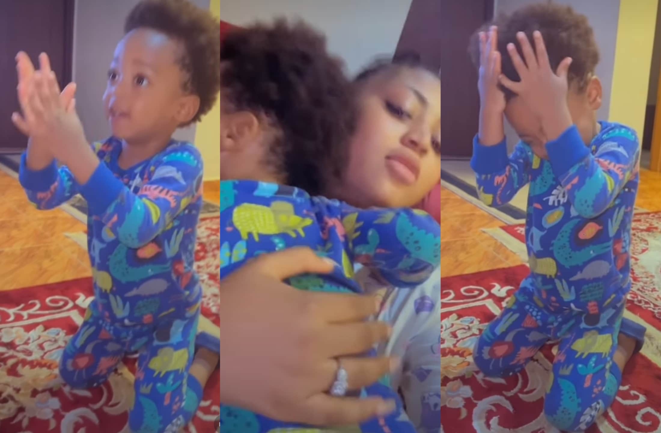 Nollywood actress and wife of a business mogul, Mrs Regina Daniels-Nwoko, and her son, Munir, has caused a stir in the social media, following the little boy remorse and kneeling down after spoiling a toy his mother bought for him.
