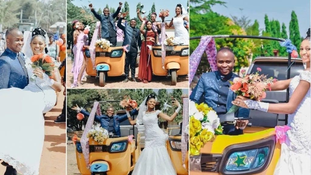 Nigerian man and his bride have got many talking online as they arrived their wedding reception in two tricycles, locally named Keke Napeps.
