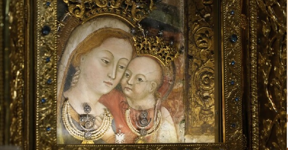 She’s either portrayed alone or, most often, holding the baby Jesus, as in the Genazzano 15th century painting, a close-up of the two faces with Jesus’ fingers holding his mother’s neck. Mary looking at Jesus makes a theological point, too — inviting worshippers to fix their gaze on Christ, not her.
