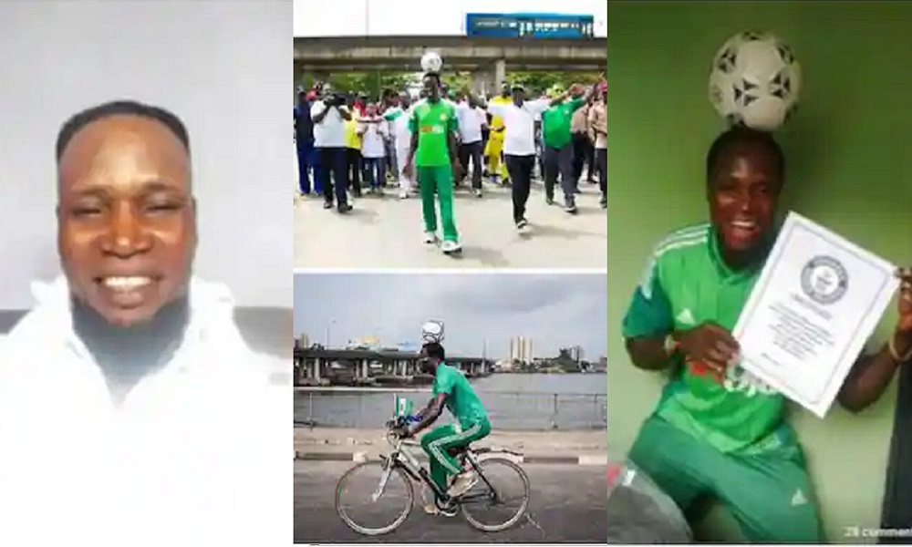 The football lover’s records are; the greatest distance travelled with a football balanced on the head, set on 6th March 2016; the greatest distance travelled on a bicycle while balancing a football on the head, set on 20th November 2016; and the most T-shirts removed while heading a football set on 20th March 2021.