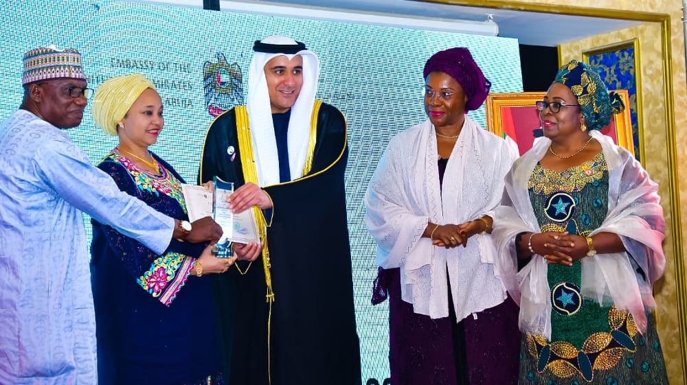 The Chairman/Chief Executive Officer of the National Drug Law Enforcement Agency, (NDLEA), Brig-Gen. Buba Marwa (rtd), represented by his wife, Haj. Munirat Marwa being presented with a Special Recognition Award by the UAE Ambassador to Nigeria, His Excellency Dr. Fahad Al-Taffaq, in Abuja …Monday: