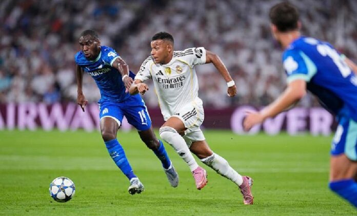 Kylian Mbappé converted two penalties to help 10-man Real Madrid came from behind to beat visiting Marseille 2-1 on Tuesday on the opening night of the Champions League.