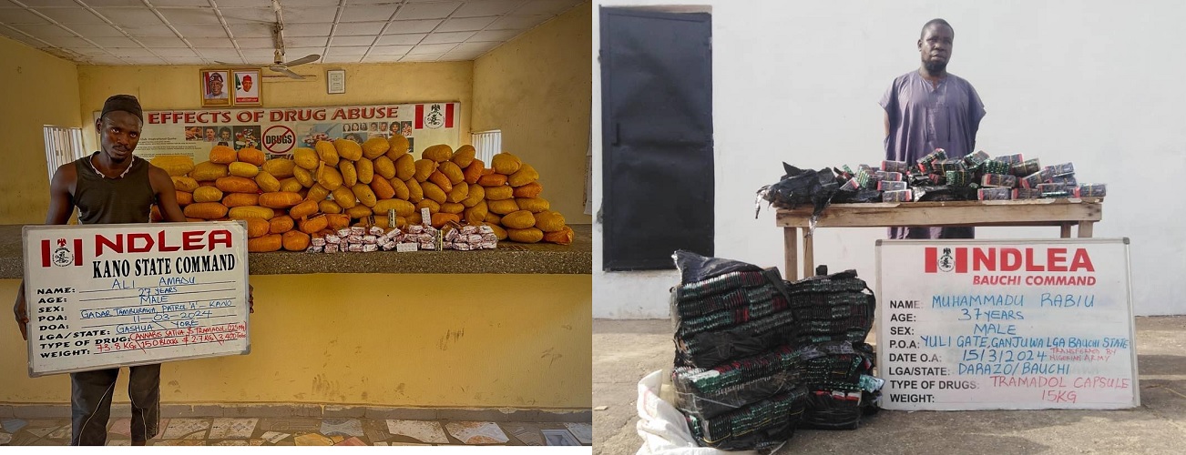 At least, 24kg of cannabis was seized from the driver of a transport company, Ikechukwu Obialo, at Sagamu Interchange, Ogun state by NDLEA operatives on Wednesday 13th March, while in Kano, two suspects: Ali Amadu, 27, and Adamu Hassan, 33, were nabbed with a total of 125.3kg cannabis; 3,400 pills of tramadol; and 30 bottles of codeine syrup. They were arrested on Monday 11th March at Gadar Tamburawa area, and Friday 15th March at Tsamiya Babba, Hotoro respectively.