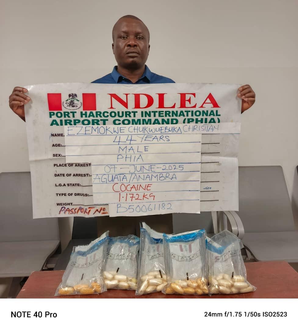 Barely two weeks after operatives of the National Drug Enforcement Agency (NDLEA) at the Mallam Aminu Kano International Airport (MAKIA) Kano, intercepted a 60-year-old businessman Chinedu Leonard Okigbo heading to Iran with 65 pellets of cocaine in his stomach, their counterparts at the Port Harcourt International Airport (PHIA) have arrested another businessman, 44-year-old Ezemokwe Chukwuebuka Christian for ingesting 53 wraps of the same class A drug while on his way to Tehran Khomeini, Islamic Republic of Iran.