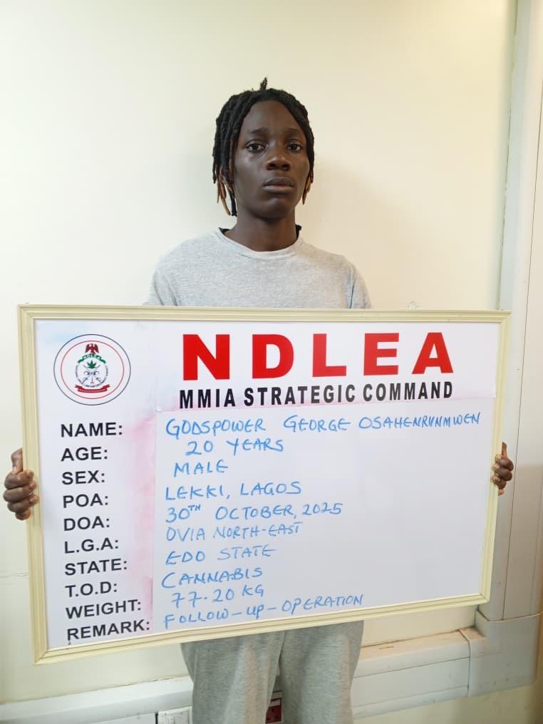 The 20-year-old music artist was nabbed at Bougain Villa, Primewater Gardens 2, Freedom way, Lekki Lagos when he showed up as the consignee to take delivery of the 140 bags of Loud with a gross weight of 77.20kg on behalf of a syndicate, which includes his manager, Zion Osazee Omigie (a.k.a Zee Money) who is currently at large.