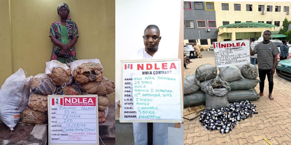 While two suspects: Moses Akowe, 32, and Sunday Gabriel, 31, were arrested with 227.1kgs of cannabis on Tuesday 11th September at Ikebe village, Ankpa LGA, Kogi state, a female suspect, Bilikisu Salako, 35, was nabbed with 108kgs of same substance on Saturday 16th September in Ifo area of Ogun state.