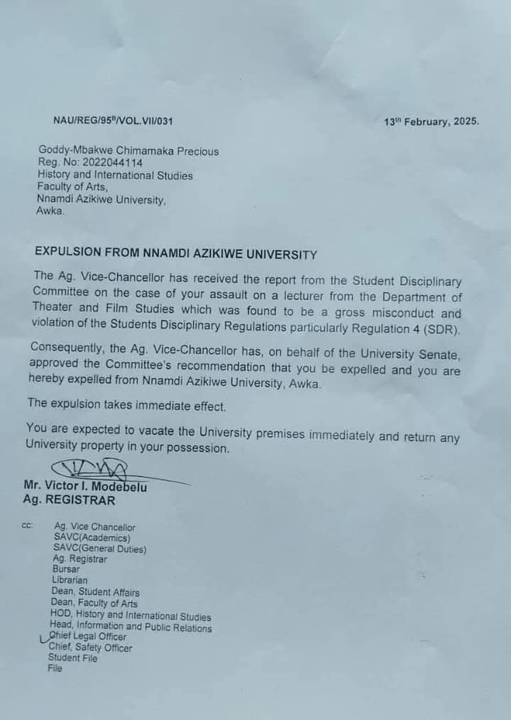 The expulsion of the student was contained in a letter dated February 13, 2025 and signed by the Acting Registrar, Victor I. Modebelu.