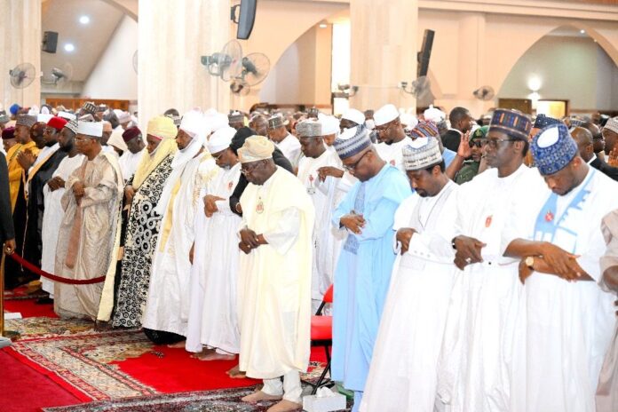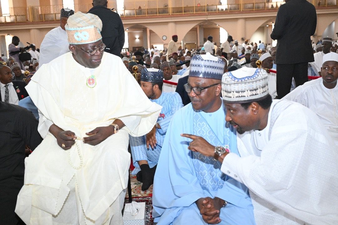 President Bola Ahmed Tinubui; Speaker House of Representatives, Tajudeen Abbas; and Deputy Senate President, Jubril Barau, during the JummaƔh prayer and wedding Fatiha of the Children of Senator Barau and Emir of Bichi, Ado Bayero at the National Mosque Abuja on FridayKatsina State Governor, Dikko Umaru Radda; Yobe State Governor, Mai Mala Buni; Deputy Senate President, Senator Jubril Barau; Speaker House of Representatives, Tajudeen Abbas; President Bola Ahmed Tinubu; Chief of Staff to the President, Femi Gbajabiamila; Emir of Bichi, Nasiru Ado Bayero and others at the JummaƔh prayer and wedding fatiha of the Children of Senator Barau and Emir of Bichi, Ado Bayero at the National Mosque Abuja on FridayPresident Bola Ahmed Tinubui; Speaker House of Representatives, Tajudeen Abbas; Deputy Senate President, Jubril Barau and APC National Chairman, Abdullahi Ganduje during the JummaƔh prayer and wedding Fatiha of the Children of Senator Barau and Emir of Bichi, Ado Bayero at the National Mosque Abuja on Friday