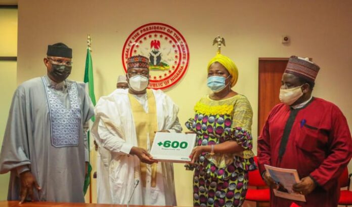 Chairman/CEO, Nigerians in Diaspora Commission (NIDCOM), Hon Abike Dabiri-Erewa, presenting a Compendium titled: ” +600 Diaspora Icons @ 60″‘ a publication that celebrates Nigerians excelling in different fields of endeavour in the Diaspora to the President of the Senate, Senator Dr Ahmad Lawan and Senator Ovie Omo-Agege, Deputy Senate President and other Principal Officers of the Senate, while Engr Dr Sule Yakubu Bassi, NIDCOM Secretary looks on in Abuja.Hon. Abike Dabiri-Erewa, Chairman/CEO, Nigerians in Diaspora Commission, (NIDCOM) presenting a book compendium entitled: ” +600 Diaspora Icons @ 60″‘ a publication that celebrates Nigerians excelling in different fields of human endeavour in the Diaspora to the Speaker of the House of Representatives, Hon. Femi Gbajabiamila, with Hon. Tolulope Akande-Shadipe, Chairman, Diaspora Affairs in the House of Representatives in Abuja.