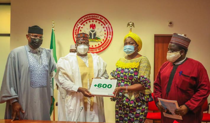 Chairman/CEO, Nigerians in Diaspora Commission (NIDCOM), Hon Abike Dabiri-Erewa, presenting a Compendium titled: " +600 Diaspora Icons @ 60"' a publication that celebrates Nigerians excelling in different fields of endeavour in the Diaspora to the President of the Senate, Senator Dr Ahmad Lawan and Senator Ovie Omo-Agege, Deputy Senate President and other Principal Officers of the Senate, while Engr Dr Sule Yakubu Bassi, NIDCOM Secretary looks on in Abuja.