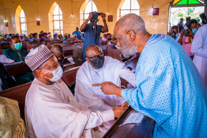 L-R: Kebbi State Governor, Abubakar Atiku Bagudu; Ekiti State Governor, Dr Kayode Fayemi; and former national Assembly member, Senator Olusola Adeyeye; during the funeral service of the late Madam Deborah Adeyeye at St Stephen’s Anglican Church, Ora Igbomina, Osun State… on Saturday.