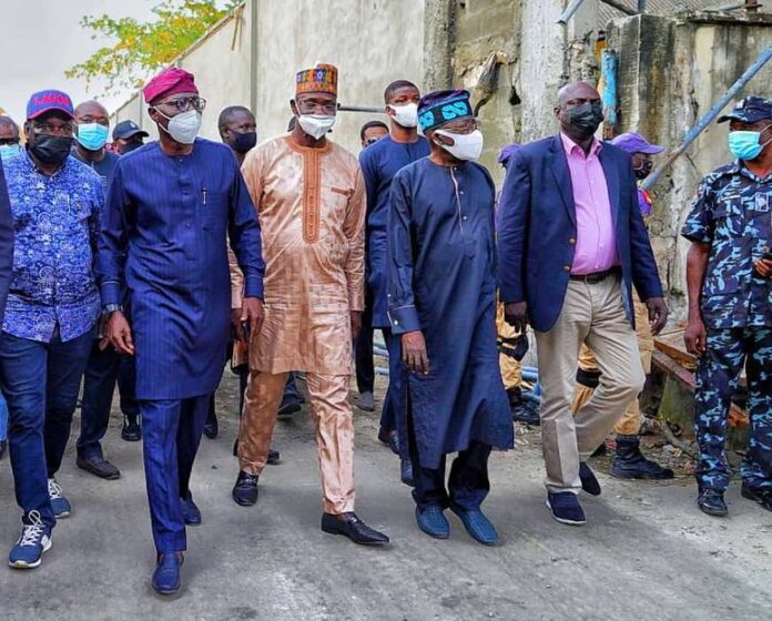 L-R: Director General, Lagos State Emergency Management Agency (LASEMA), Dr. Femi Oke-Osanyitolu; APC National Leader, Asiwjau Bola Tinubu; Nasarawa State Governor, Engr. Abdullahi Sule and Governor Babajide Sanwo-Olu during a visit to the site of the Ikoyi building collapse on Saturday, November 6, 2021.