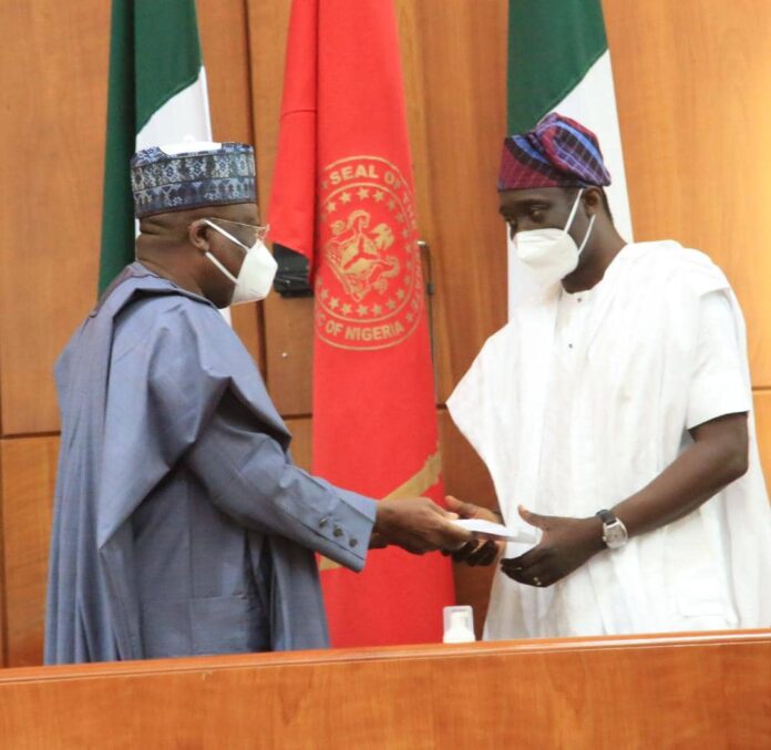 Senate President, Dr Ahmed Lawan, during the swearing in of Senator Jarigbe to represent Cross River North District at the Upper Chamber of the National Assembly in Abuja on Wednesday.