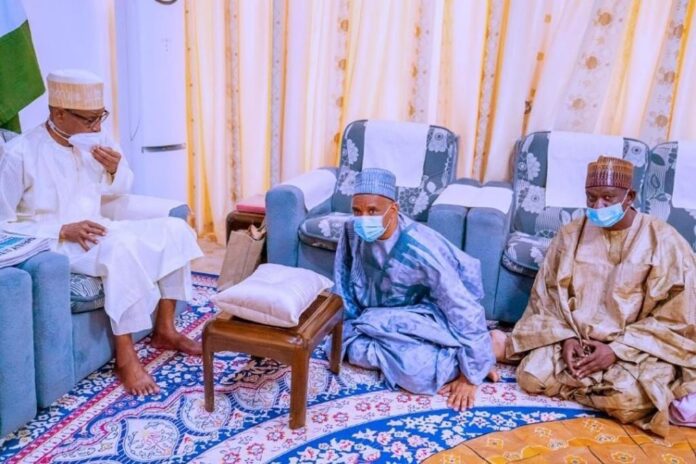L-R: President Muhammadu Buhari; Director General, Nigerian Maritime Administration and Safety Agency (NIMASA), Dr. Bashir Jamoh; and Alhaji Yusuf Musa, when the NIMASA Director General paid Sallah homage to the President.
