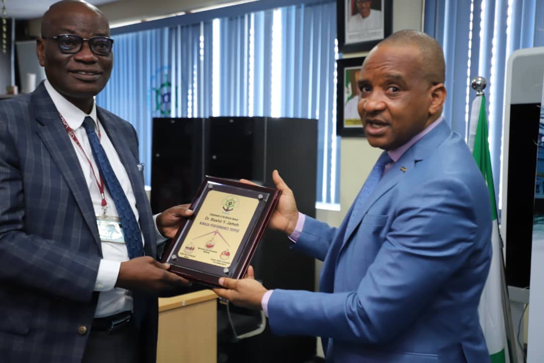 Director General, Nigerian Maritime Administration and Safety Agency (NIMASA), Dr. Bashir Jamoh (right), handing a souvenir to the Vice Chancellor of the University of Lagos, Professor Oluwatoyin Ogundipe, during a courtesy visit to the Agency’s headquarters in Lagos, recently.