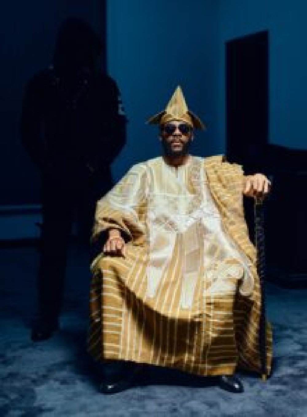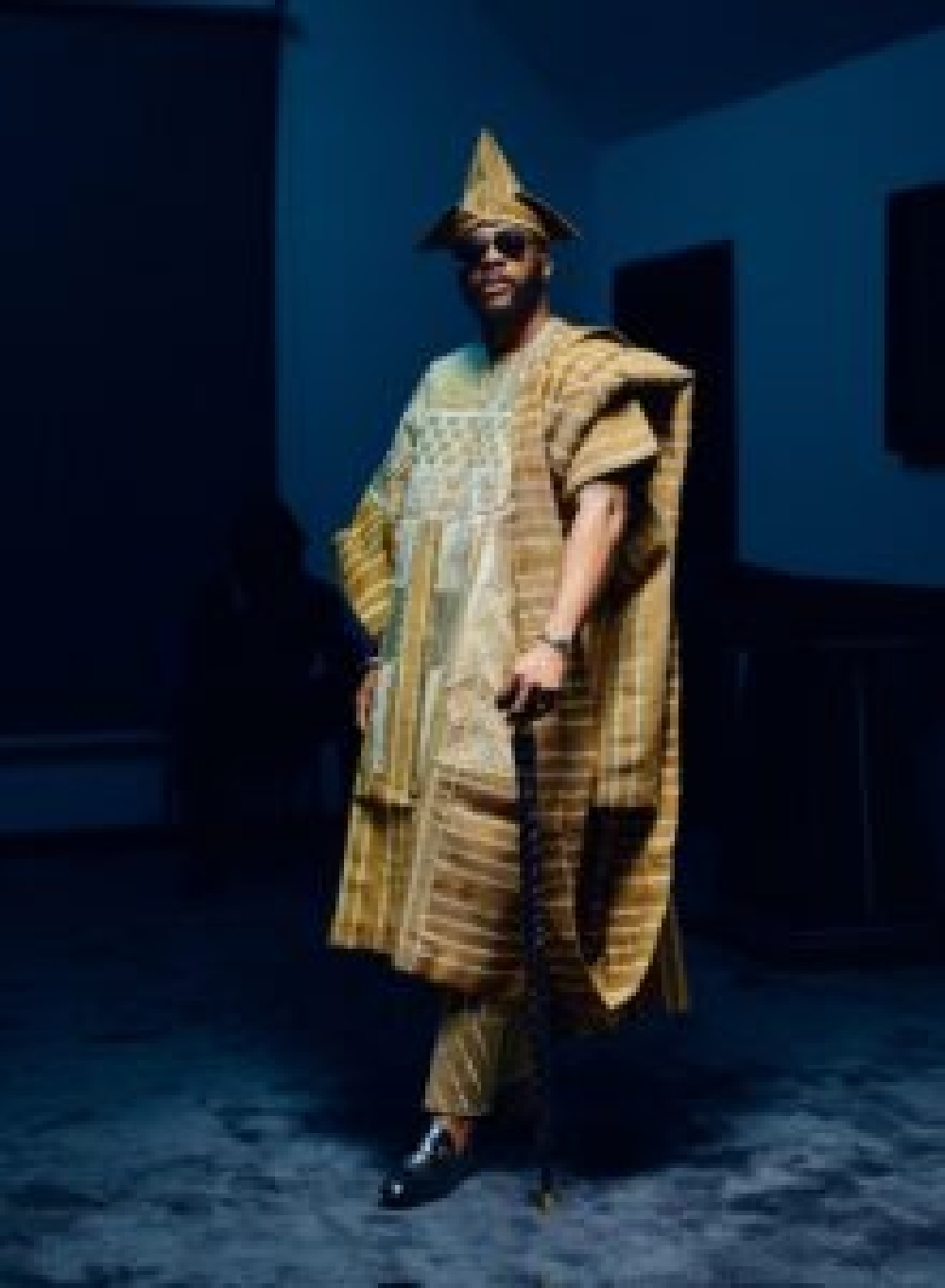 The famous host paired the agbada with a regal cap and walking staff and posed with a mysterious ninja-clad figure that may exemplify Carter in the historic picture.