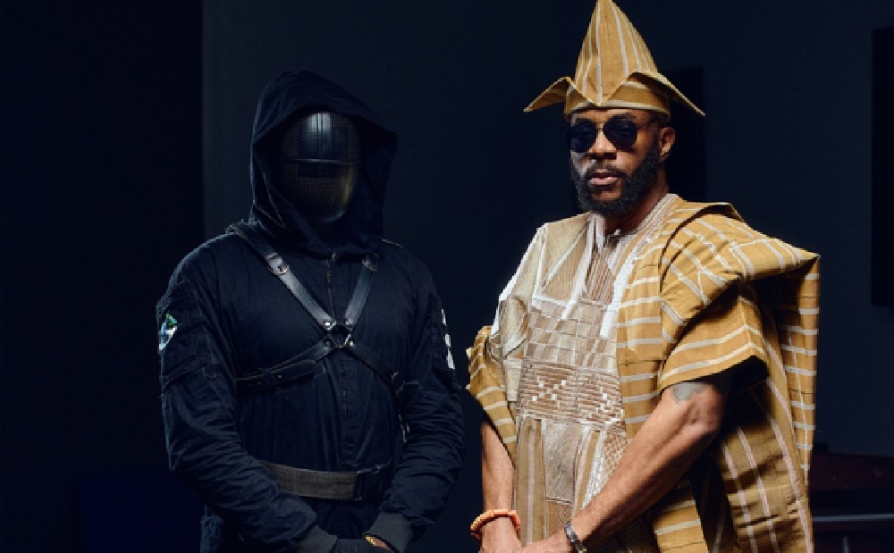 The famous host paired the agbada with a regal cap and walking staff and posed with a mysterious ninja-clad figure that may exemplify Carter in the historic picture.