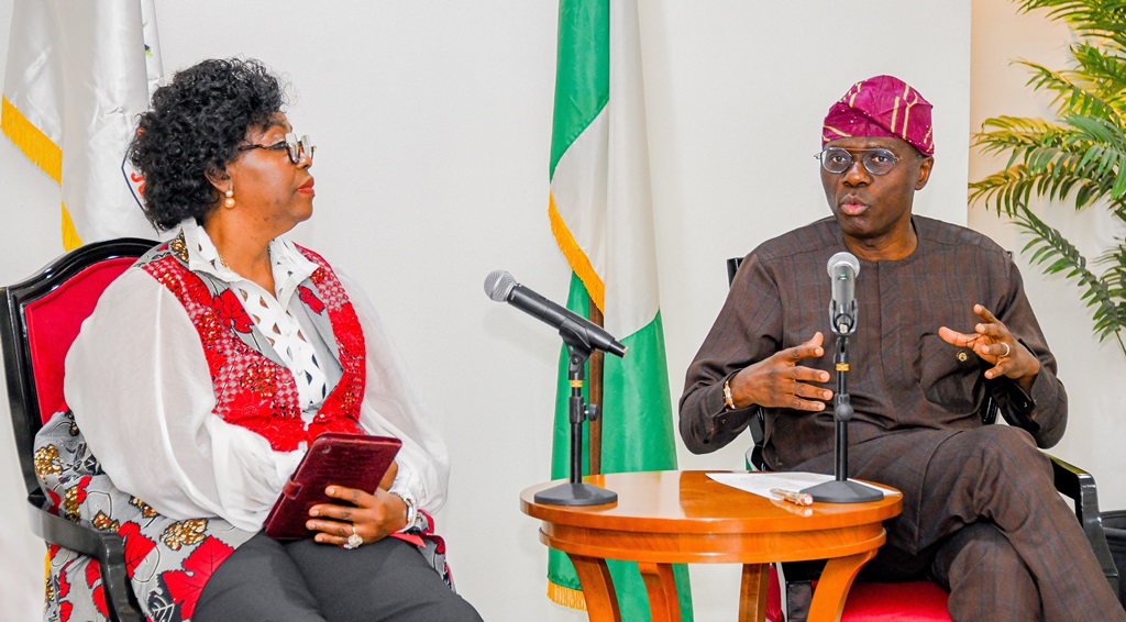 Lagos State Governor, Mr Babajide Sanwo-Olu (right) making his remark, when Lady Kehinde Kamson, National President of Restaurant and Food Services Proprietors Association of Nigeria (RESPAN) and the MD/CEO of Sweet Sensation Nigeria (left) with other Executive members paid him a courtesy visit, at Lagos House, Marina, on Tuesday, 3 January 2023.