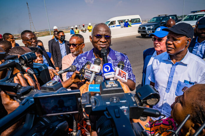 Hon. Minister of Works and Housing, Mr Babatunde Fashola,SAN (middle) flanked by the President, Nigerian Guild of Editors, Mr Mustapha Isah (right) and Delta State's Hon. Commissioner for Works (Highway and Urban Roads), Engr. Noel Omodon as he addresses journalists on the new Bridge on Wednesday, 14th December 2022 during an inspection of the 2nd Niger Bridge in Anambra and Delta States which will open to motorists travelling from the West to the East during the yuletide period on Thursday, 15th December, 2022.