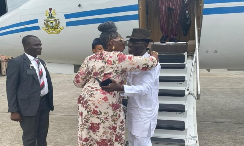 Former Chief of Defence Staff, General Lucky Irabor returned to the shores of Nigeria on Wednesday to the warm embrace of his wife, Barr Mrs Victoria Irabor.