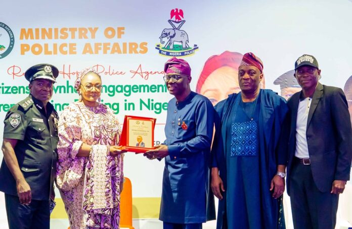 l-r: Assistant Inspector General of Police Zone 2, Lagos, AIG Ali Muhammed; Minister of State, Police Affairs, Hon. Imaan Sulaiman-Ibrahim presenting an award of excellence to Governor of Lagos State, Mr. Babajide Sanwo-Olu; Senator representing Oyo Central Senatorial District, Senator Yunus Akintunde and Chairman, Police Community Relations Committee (PCRC) Lagos, Apostle Kehinde Sowemimo, during the Ministry of Police Affairs Citizens Town Hall Engagement on Strengthening Policing in Nigeria, at the Lagos Continental Hotel, Victoria Island, on Monday, 11 December 2023.