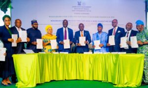 Pix 1013 from right: Governor of Lagos State, Mr. Babajide Sanwo-Olu; his Deputy, Dr. Obafemi Hamzat; Commissioner for Finance, Mr. Oluyomi Abayomi; SSG, Barr. ‘Bimbola Salu-Hundeyin; Head of Service, Mr. Bode Agoro and the Accountant General and Permanent Secretary, State Treasury Office, Dr. Abiodun Muritala during the official signing ceremony of the Lagos State government transaction document, at the Federal Palace Hotel, Victoria Island, on Thursday, November 20, 2025.