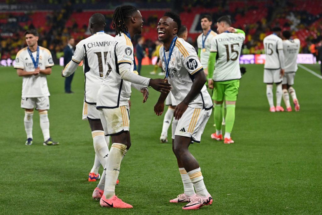 Italian coach Carlo Ancelotti is thrown in the air by his players as they celebrate after the UEFA Champions League final football match between Borussia Dortmund and Real Madrid, at Wembley stadium, in London, on June 1, 2024. (Photo by INA FASSBENDER / AFP)Real Madrid’s players lift the trophy to celebrate their victory at the end of the UEFA Champions League final football match between Borussia Dortmund and Real Madrid, at Wembley stadium, in London, on June 1, 2024. (Photo by Glyn KIRK / AFP)Carlo Ancelotti lifts the trophy to celebrate the victory at the end of the UEFA Champions League final football match between Borussia Dortmund and Real Madrid, at Wembley stadium, in London, on June 1, 2024. (Photo by Glyn KIRK / AFP)Brazilian forward #07 Vinicius Junior (R) celebrates after winning at the end of the UEFA Champions League final football match at Wembley stadium, in London, on June 1, 2024. (Photo by Glyn KIRK / AFP)Real Madrid’s players celebrate after winning the UEFA Champions League final football match between Borussia Dortmund and Real Madrid, at Wembley stadium, in London, on June 1, 2024. – Real Madrid wins the Champions League final 2 – 0 against Borussia Dortmund. (Photo by Paul ELLIS / AFP)Spanish defender #06 Nacho Fernandez (C) and Real Madrid’s players lift the trophy to celebrate their victory at the end of the UEFA Champions League final football match between Borussia Dortmund and Real Madrid, at Wembley stadium, in London, on June 1, 2024. (Photo by Glyn KIRK / AFP)French defender #18 Aurelien Tchouameni lifts the trophy to celebrate the victory at the end of the UEFA Champions League final football match at Wembley stadium, in London, on June 1, 2024. (Photo by INA FASSBENDER / AFP)