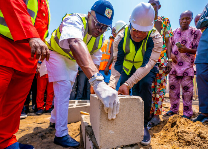 Lagos State Governor, Mr Babajide Sanwo-Olu (middle) laying a brick to takeoff the rebuild of Akere Auto Spare Parts Market, assisted by the Chairman of Ajeromi Ifelodun Local Government, Hon Fatai Ayoola (right) during the launch to rebuild the market at Olodi-Apapa, on Wednesday, 15 March 2023.