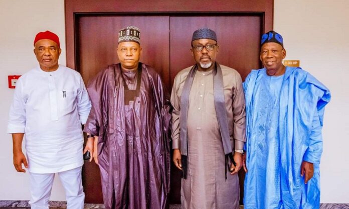 “Vice President Kashim Shettima, our National Chairman Abdullahi Ganduje, Imo State Governor Hope Uzodinma and Senator Rochas Okorocha parley,” the party posted.