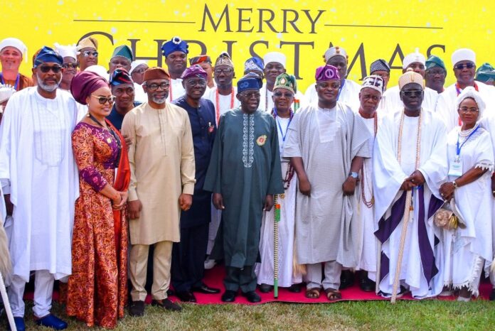 Chairman, Bariga LCDA and President, Association of Local Governments of Nigeria (ALGON), Hon. Kolade Alabi; Secretary to Lagos State Government, Barr. Abimbola Salu-Hundeyin; Deputy Governor, Dr. Obafemi Hamzat; Chief of Staff to the President, Rt. Hon. Femi Gbajabiamila; Governor Babajide Sanwo-Olu; President Bola Tinubu; Ayangburen of Ikorodu, Oba Saheed Shotobi; Speaker of the Lagos House of Assembly, Rt. Hon. Mudashiru Obasa; Oloja of Epe, Oba Kamorudeen Animashaun; Aladesoyin of Odo Noforija Kingdom, Oba Babatunde Ogunlaja; the Erelu Kuti IV of Lagos, Erelu Abiola Dosunmu with other traditional rulers, during the President’s meeting with Lagos politicians and traditional rulers in Lagos, at the Government House, Marina, on Wednesday, 27 December 2023