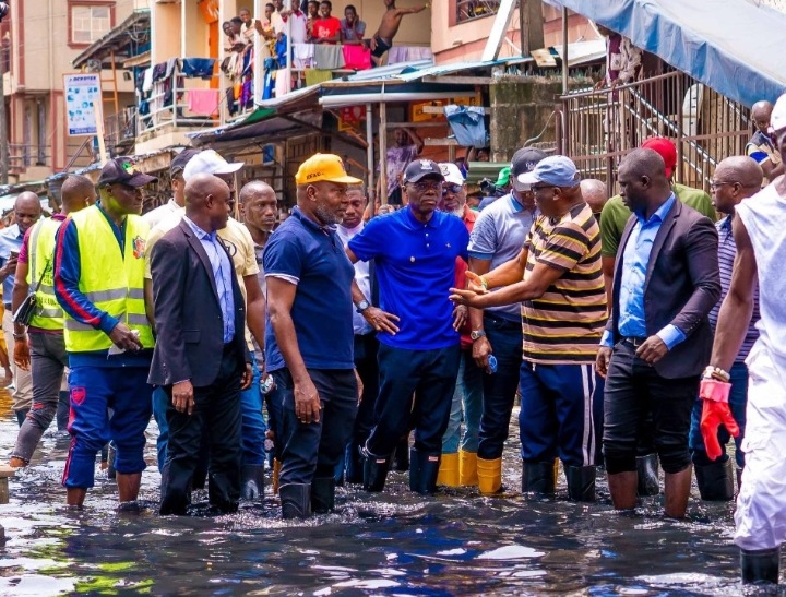 Sanwo-Olu took a walk through the waterlogged Ojo-Giwa, Oroyiyin, and Binuyo streets where drainage channels had been completely blocked by concrete structures, making it difficult for stagnant water to evacuate into the secondary drainage.