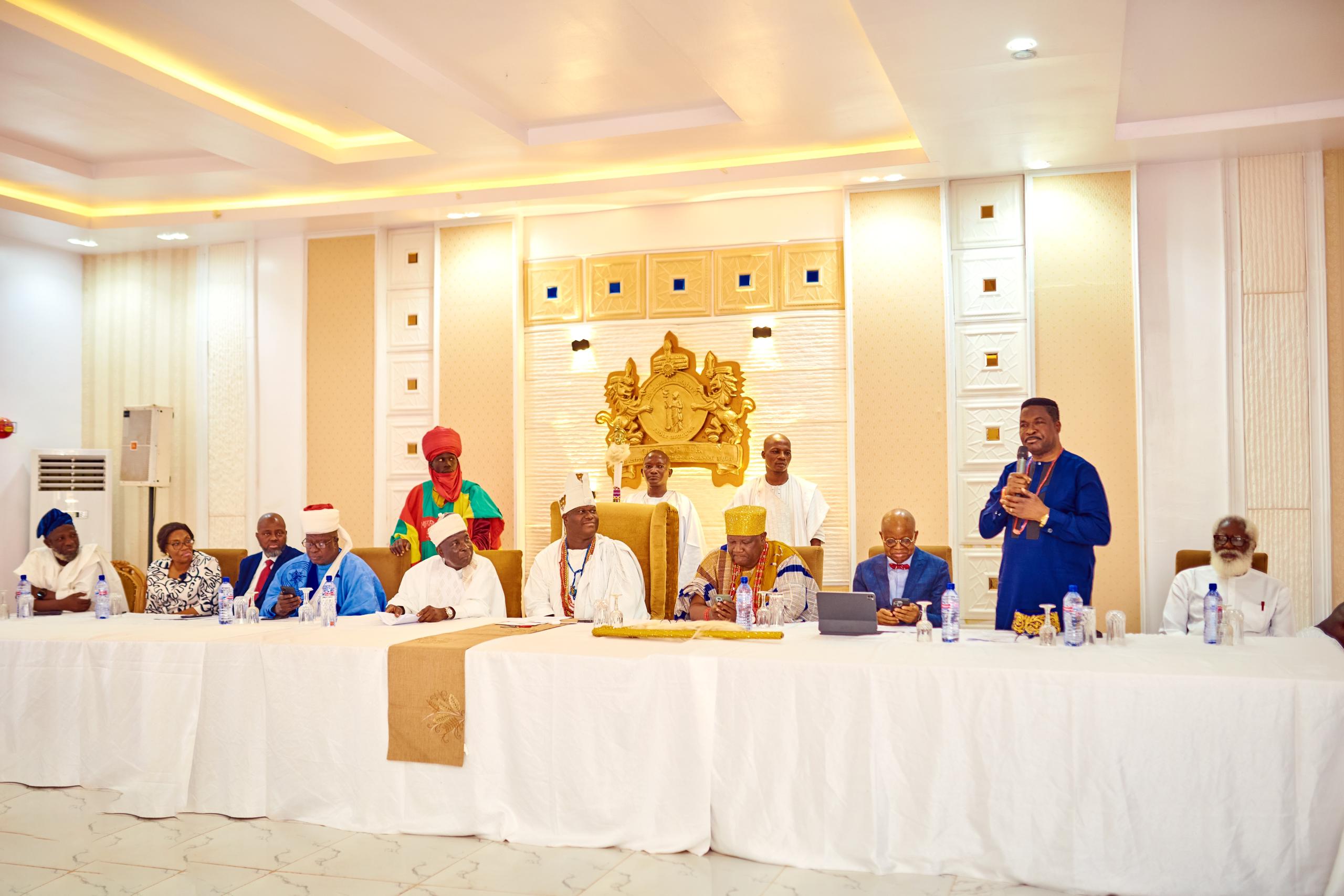 Scenes from the inauguration of the members of the Board of Trustees and Governing Council of Ojaja University (formerly called Crown Hill University, Ilorin) at the palace of Ooni of Ife in Ile-Ife, Osun State … on Monday.
