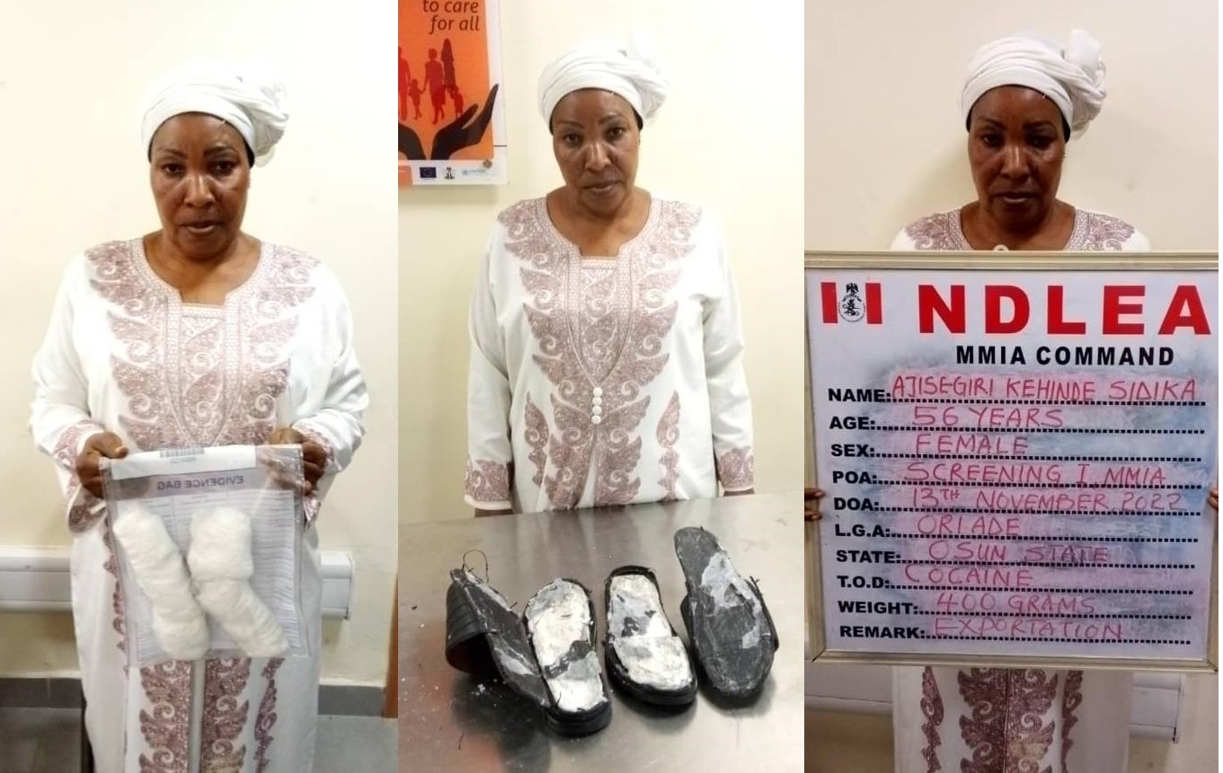 Operatives of the National Drug Law Enforcement Agency (NDLEA) have arrested a 56-year-old widow and mother of four, Mrs. Ajisegiri Kehinde Sidika, at the Murtala Muhammed International Airport, Ikeja, Lagos over her attempt to traffic 400grams of cocaine concealed in her footwear to Makkah, Saudi Arabia.