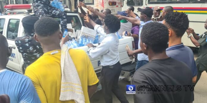 Police operatives in Lagos State were on Tuesday spotted distributing water and biscuits to protesting members of the Nigeria Labour Congress (NLC).Â
